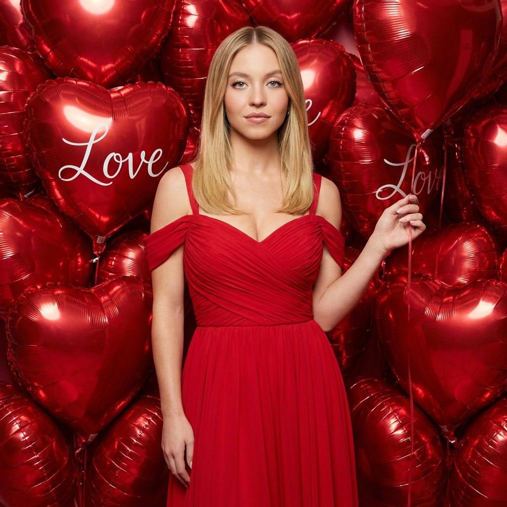 " СОХРАНИТЬ РЕАЛЬНОЕ ЛИЦО — строго сохранить точные черты лица и идентичность с референсного изображения. Без бьютификации, без стилизации. Образ модели: Женщина с прямыми волосами, уложенными на прямой пробор. Модель одета в элегантное вечернее красное платье макси. Детали платья: лиф с драпировкой (плиссировкой), вырез сердечком, тонкие бретельки и дополнительные спущенные рукава-бретели, открывающие плечи. Образ женственный, гламурный и праздничный. Поза: Модель стоит прямо, вполоборота к камере. В правой руке она деликатно держит тонкую ленточку от воздушного шара. Левая рука свободно опущена. Лицо обращено прямо в объектив. Атмосфера: День Святого Валентина, романтика и праздник любви. Эстетика глянцевой моды и роскоши. Ощущение радости, тепла и торжественности благодаря обилию красного цвета. Освещение: Качественное студийное освещение. Мягкий заполняющий свет на лице модели, подчеркивающий тон кожи. Яркие блики и отражения света на глянцевой поверхности фольгированных шаров на фоне, создающие объем и блеск. Ракурс и композиция: Средний план (по бедра). Модель расположена по центру. Фон полностью, без пробелов, заполнен множеством красных фольгированных воздушных шаров в форме сердец. На некоторых шарах видна белая рукописная надпись ""Love"". Эффекты фотографии и камеры: Высококачественная цифровая фотография с отличной резкостью. Насыщенная цветовая гамма в красных тонах. Негативный промт: деформированное лицо, изменённая внешность, искажённые черты лица, низкое качество, нереалистичная кожа, нереалистичная модель, нарисованное фото, нереалистичное фото."