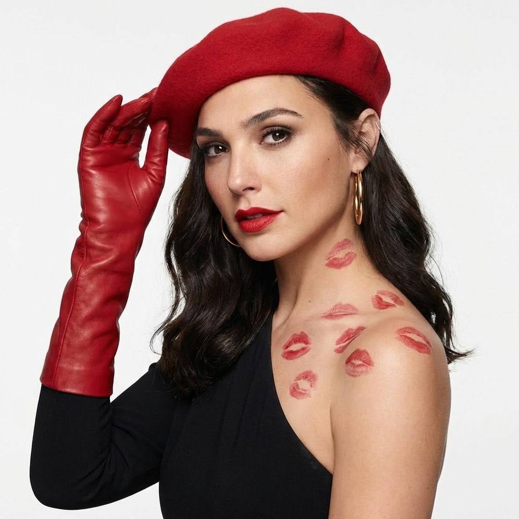 "сделай ультра реалистичное фото по моему селфи, максимально сохраняя мою внешность: мои черты лица, пропорции, природную асимметрию, форму и цвет глаз, бровей и губ, цвет и текстуру кожи, цвет и структуру волос; не меняй мой возраст и тип фигуры, не выравнивай и не «улучшай» лицо, soft skin realism. Выражение лица как на фото. Женщина с моего фото позирует в полуанфас, слегка повернувшись к камере, взгляд направлен прямо. На голове — красный берет, который она слегка придерживает левой рукой в длинной красной кожаной перчатке. На женщине с моего фото чёрное платье с асимметричным вырезом, открывающим одно плечо. На шее, ключицах и плече расположены отпечатки губной помады насыщенного красного цвета — около 7–8 отпечатков разного размера, распределённых хаотично, но эстетично. В ушах — крупные золотые серьги-кольца. Волосы уложены свободными волнами, спадают на одно плечо. Макияж выразительный: чётко очерченные брови, дымчатые тени на веках, длинные ресницы, губы покрыты помадой в тон отпечаткам на коже. Фон нейтральный, белый, без деталей, подчёркивает объект съёмки. Освещение мягкое, рассеянное, создаёт нежные тени и подчёркивает текстуры одежды и аксессуаров. Композиция кадра вертикальная, фокус на верхней части тела и лице. Качество изображения — высокое, с чёткими деталями. Водяных знаков и текста на фото нет. НЕГАТИВНЫЙ ПРОМПТ: не менять мои черты лица и природную асимметрию, не менять цвет и длину волос, не менять возраст, без пластиковой кожи и сильной ретуши, без искажений тела, без лишних рук/пальцев, без склеивания, без кривых пропорций, без грязных артефактов, без мультяшности, без чрезмерного HDR, без кислотных цветов, без текста и логотипов, без лишних людей в кадре"
