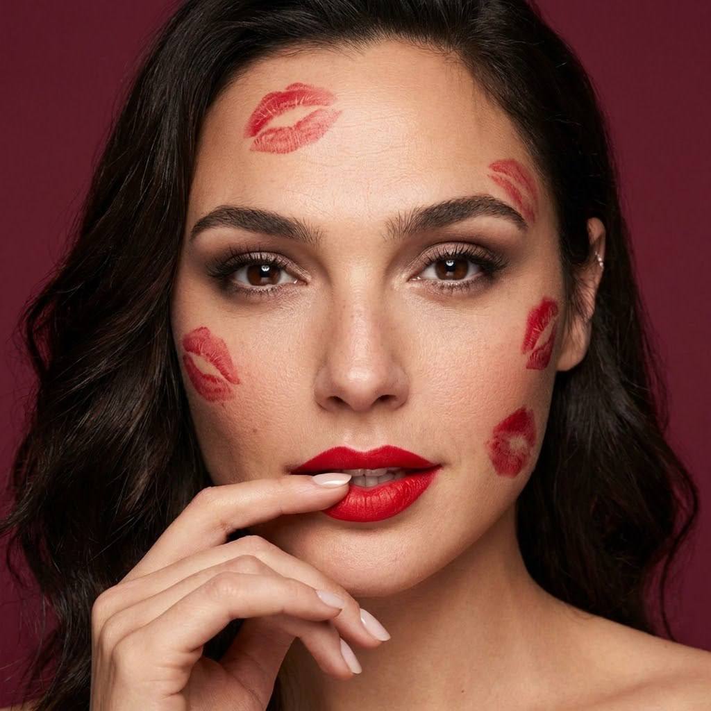 "сделай ультра реалистичное фото по моему селфи, максимально сохраняя мою внешность: мои черты лица, пропорции, природную асимметрию, форму и цвет глаз, бровей и губ, цвет и текстуру кожи, цвет и структуру волос; не меняй мой возраст и тип фигуры, не выравнивай и не «улучшай» лицо, soft skin realism. Выражение лица как на фото. Сгенерируй студийный портрет крупным планом (headshot) с акцентом на лице. Модель с моего фото расположена по центру кадра, взгляд направлен прямо в камеру. Одна рука слегка касается губ, создавая игривую позу. Макияж выразительный: чётко очерченные брови, дымчатые тени на веках, длинные ресницы. Губы покрыты яркой красной помадой. На коже лица (щёки, лоб, область под глазом) — несколько отпечатков от поцелуев красной помадой разного размера, распределённых асимметрично. Волосы уложены мягкими локонами, частично обрамляют лицо. Ногти аккуратно ухожены, покрыты светлым лаком. Фон — однотонный, насыщенного бордового цвета, без деталей, подчёркивает объект съёмки. Освещение мягкое, студийное, с тёплым подтоном, создаёт нежные тени и подчёркивает текстуры кожи и макияжа. Композиция вертикальная, соотношение сторон примерно 3:4. Качество изображения — гиперреалистичное, с чёткой детализацией. Текста на фото нет. Акцент на выразительном макияже и экспрессивной позе модели. НЕГАТИВНЫЙ ПРОМПТ: не менять мои черты лица и природную асимметрию, не менять цвет и длину волос, не менять возраст, без пластиковой кожи и сильной ретуши, без искажений тела, без лишних рук/пальцев, без склеивания, без кривых пропорций, без грязных артефактов, без мультяшности, без чрезмерного HDR, без кислотных цветов, без текста и логотипов, без лишних людей в кадре"