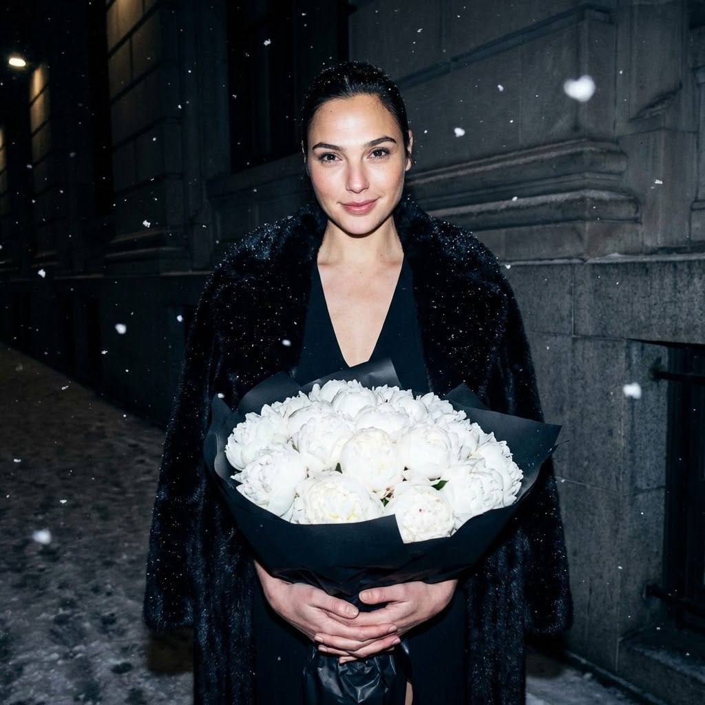 "Ночной уличный снимок со вспышкой: зимний момент с пионами Сцена и атмосфера Девушка стоит на ночной улице у каменного здания, держит двумя руками огромный букет белых пионов в чёрной упаковке. Момент случайного уличного снимка на iPhone, без постановки. Атмосфера холодной зимней ночи, падающий снег, ощущение спонтанности и живого момента. Девушка — строго сохранить внешность с загруженного фото 1:1: черты лица, форма глаз, губ, носа, линия бровей, оттенок кожи с естественной текстурой, возраст и пропорции. Загруженное фото — единственный эталон внешности. Без ретуши, без идеализации, без изменений. Одежда и детали Девушка: чёрное вечернее платье с V-образным вырезом, поверх — чёрная меховая шуба. В руках — огромный букет белых пионов в чёрной матовой упаковке. Одежда сидит естественно, мех имеет реалистичную текстуру. Без украшений, логотипов и надписей. Локация и фон Ночная улица, каменное здание с архитектурными деталями на заднем плане. Падающий натуральный снег, снежинки видны в воздухе. Тёмная городская архитектура, уличная атмосфера. Фон слегка размыт, но детали здания читаются. Свет Жёсткая прямая on-camera flash (встроенная вспышка iPhone): плоский свет, резкие тени за фигурой, лёгкий пересвет на лице и букете. Снежинки ярко подсвечены вспышкой, создавая эффект белых точек в воздухе. Фон остаётся тёмным, контраст между освещённой фигурой и ночной улицей. Без мягкого света, без заполняющего — характерный эффект прямой вспышки. Камера и оптика iPhone или смартфон с широкоугольным объективом, эквивалент 26-28 мм. Камера на уровне груди, фронтальная съёмка без художественного ракурса. Автофокус на лице, средняя глубина резкости. Заметное цифровое зерно ISO 800-1600 из-за ночной съёмки. Резкость характерная для смартфона — чёткая в центре, чуть мягче по краям. Цвет и обработка Естественная цветопередача iPhone с лёгким холодным уклоном ночной съёмки. Белые пионы яркие от вспышки, чёрная шуба и упаковка контрастные, кожа с естественным оттенком и лёгким пересветом. Снег белый, архитектура в холодных серо-синих тонах. Умеренный контраст, цифровое зерно видимо. Без художественной обработки, без фильтров — чистый снимок с камеры. Композиция Вертикальный портретный формат (9:16 или 4:5). Девушка по центру кадра, букет занимает нижнюю треть. Взгляд прямо в камеру, выражение лица мягкое, лёгкая улыбка. Композиция прямая, без наклона, как держат телефон при обычной съёмке. Кадр выглядит как случайный уличный снимок. Технические параметры Максимальный фотореализм, максимальная детализация, 8K. Естественная текстура кожи без сглаживания, видимые поры, реалистичный мех шубы, детальная структура пионов, текстура снежинок. Негативный промпт морфинг лица, изменение внешности девушки, ретушь кожи, пластиковый эффект, идеализация черт, студийный свет, мягкий свет, художественное освещение, HDR, перенасыщенность, профессиональная обработка, wide-angle искажения лица, боке, размытый фон, цветные фильтры, винтажная обработка, открытые зубы, драматическая поза, постановочная композиция, логотипы, текст"