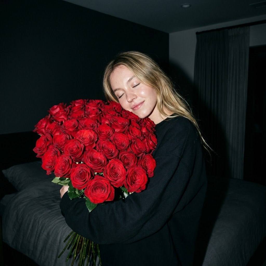 " Ночной домашний снимок со вспышкой: объятие с розами Сцена и атмосфера Девушка обнимает очень большой букет красных роз, прижимая его к груди. Голова виском лежит на букете, глаза закрыты, нежная улыбка на лице. Атмосфера интимного случайного ночного фото, эффект raw, candid момента, пойманного со вспышкой. Девушка — использовать загруженное фото как единственный и абсолютный эталон. СТРОГО сохранить внешность 1:1: лицо, черты, форма глаз, губ, носа, линия бровей, оттенок кожи с естественной текстурой, возраст, пропорции, мимику и позу. Без улучшений, без идеализации, без ретуши, без изменений. Одежда и детали Девушка: чёрный оверсайз-свитшот с длинными рукавами, сидит свободно. Волосы распущены, лежат свободно и естественно, без укладки. В объятиях — очень большой букет насыщенно-красных роз (минимум 50-70 роз), плотный, объёмный. Без украшений, логотипов и надписей. Локация и фон Реальный домашний интерьер ночью, тёмная спальня. Серо-чёрные стены, различимы силуэты кровати и штор на заднем плане. Пространство погружено в темноту, детали едва читаются. Без декоративного освещения, без цветного света. Фон остаётся тёмным и натуральным, освещена только фигура девушки. Свет СТРОГО один источник: жёсткий фронтальный on-camera flash. Прямой свет в лоб, холодная нейтральная цветовая температура (5500-6000K). Пересветы на лице, розах и одежде допустимы и желательны. Жёсткие резкие тени за объектом обязательны — тень падает на стену позади. Контраст между ярко освещённой фигурой и тёмным фоном. ЗАПРЕЩЕНО: soft light, ambient light, оконный свет, заполняющий свет, отражённый свет. Камера и технические параметры Камера Sony FX2 (профессиональная кинокамера в режиме фото). Вертикальный кадр (портретная ориентация). Статичная съёмка, камера на уровне лица девушки, фиксированная дистанция. Объектив средний (35-50 мм эквивалент), f/2.8-4.0. Фокус на лице, средняя глубина резкости — лицо и розы в резкости, фон слегка размыт. Лёгкое цифровое зерно ISO 800-1600 из-за ночной съёмки. Цвет и обработка Холодная нейтральная цветопередача от вспышки: кожа с естественным оттенком и лёгким пересветом, красные розы яркие и насыщенные от прямого света, чёрный свитшот глубокий. Фон в холодных серо-чёрных тонах. Умеренный контраст между светом и тенью. Видимое цифровое зерно. Без художественной обработки, без тёплых тонов, без фильтров — чистый raw-вывод. Композиция Вертикальный формат (9:16 или 2:3). Девушка занимает центральную и верхнюю часть кадра, букет роз — от груди до подбородка. Голова наклонена, виском лежит на розах. Глаза закрыты, нежная расслабленная улыбка. Руки обнимают букет. Композиция естественная, не постановочная. Поза и мимика Голова виском прижата к букету, шея слегка наклонена. Глаза полностью закрыты, веки расслаблены. Нежная, тихая улыбка на губах — не широкая, без зубов. Выражение лица умиротворённое, интимное. Руки обнимают букет, прижимая к груди. Поза естественная, без напряжения. Настроение Тихая нежность, интимность, случайный момент счастья. Raw, candid эстетика ночного снимка со вспышкой. Без глянца, без постановки. Негативный промпт морфинг лица, изменение внешности, идеализация черт, ретушь кожи, сглаживание текстуры, улучшение внешности, мягкий свет, ambient light, оконный свет, студийное освещение, заполняющий свет, отражённый свет, тёплая цветовая температура, HDR, профессиональная обра