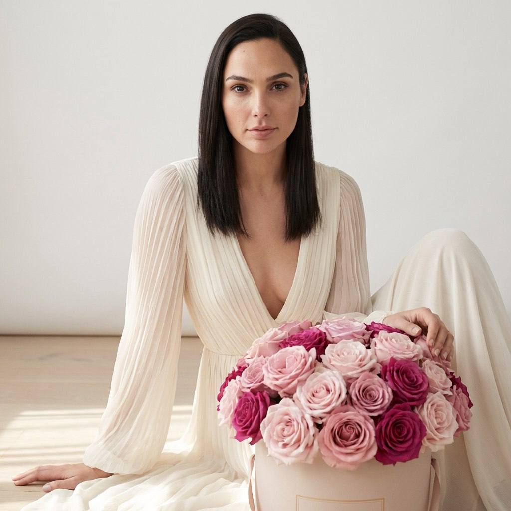 " СОХРАНИТЬ РЕАЛЬНОЕ ЛИЦО — строго сохранить точные черты лица и идентичность с референсного изображения. Без бьютификации, без стилизации. Эстетичная студийная фотосессия в стиле «романтический минимализм» с атмосферой утреннего света, чистоты и нежной флористической роскоши. Фон — однотонная молочно-белая студийная стена без текстур, создающая ощущение воздуха и спокойствия. В кадре присутствует мягкое естественное освещение, подчёркивающее пастельные оттенки и изящество композиции. Поза модели Модель сидит на полу, корпус расположен фронтально к камере. Одна ноги элегантно согнуты. Одна рука опирается на пол сбоку, вторая лежит рядом с круглой коробкой с цветами. Спина прямая, плечи опущены. Голова слегка наклонена вперёд, взгляд направлен прямо в камеру. Поза мягкая, статичная, подчёркивающая линию плеч, ключицы и талию. Образ модели Идеально гладкие, прямые, распущенные волосы. Наряд — длинное молочно-кремовое платье с глубоким вырезом и полупрозрачными плиссированными рукавами, создающее образ современной невесты или цветочной музы. Аксессуары отсутствуют, образ максимально чистый и утончённый. Атмосфера Нежная, светлая и романтичная. Настроение — тишина, утро, ощущение свежести и цветочной поэзии. Большая круглая коробка с розами в розово-пудровых и малиновых оттенках создаёт центр композиции и добавляет ощущение подарка и роскоши. Ракурс и композиция Средний план по пояс. Камера расположена на уровне глаз модели. Модель размещена по центру кадра, цветочная коробка стоит перед ней и занимает нижнюю часть композиции. Фон полностью чистый, без отвлекающих деталей. Акцент на лице, цветах и линии декольте. Обработка фотографии Мягкая пастельная цветокоррекция с доминированием кремовых, розовых и пудровых оттенков. Кожа естественная, без пластиковой ретуши. Свет рассеянный, без жёстких теней. Контраст умеренный, эффект «воздушности» и высокой моды. Эффекты камеры Объектив 85 mm. Диафрагма f/2.8 – f/3.2 для мягкого отделения фона и чёткого фокуса на лице и цветах. Естественный источник света сбоку или спереди (имитация окна), дополнительный отражатель для подсветки лица и цветов. Лёгкий glow-эффект и минимальное зерно для художественной глубины. Негативный промт: деформированное лицо, изменённая внешность, искажённые черты лица, низкое качество, нереалистичная кожа, нереалистичная модель, нарисованное фото, нереалистичное фото"